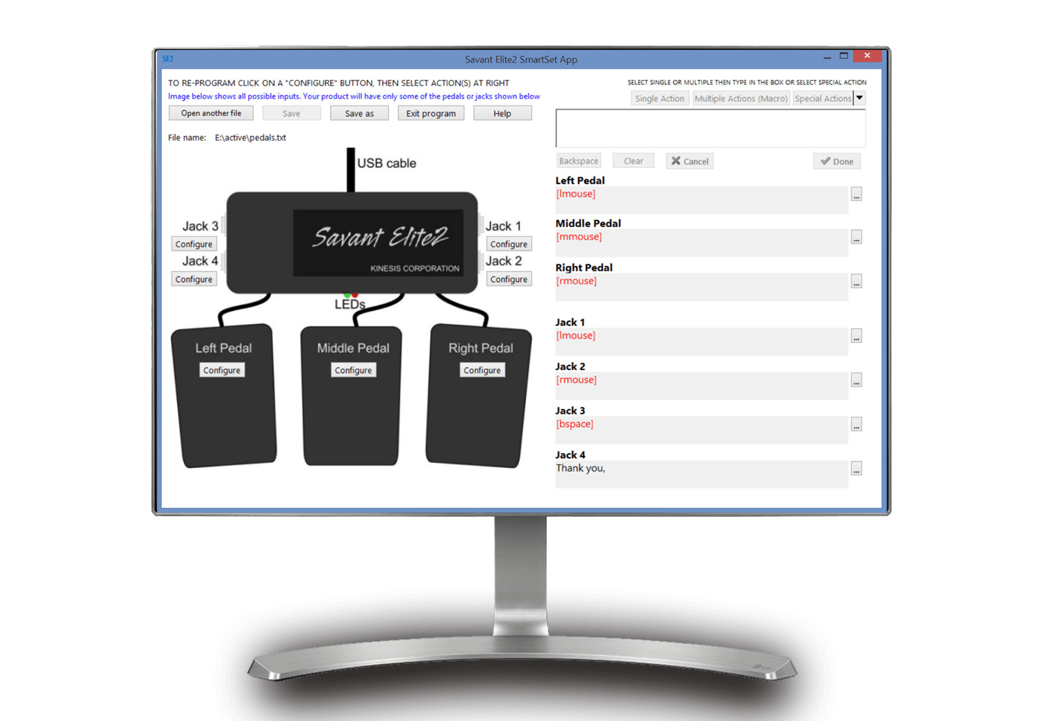 Have a custom pedal application in mind. You can re-program each of the pedal actions using the no-install SE2 SmartSet App or by directly editing the simple text configuration files stored to the pedals. Create text macros, custom key sequences or combinations for any software application that recognizes keyboard and mouse shortcuts/inputs.